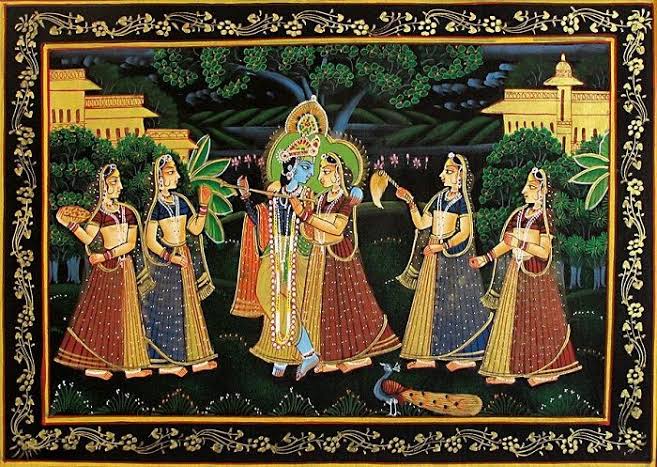 1) The Indian indigenous style of Rajasthani paintings shows bold outline and brilliant colour in a harmonious pattern.
